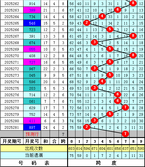 福彩3D第2025281期最大跨度开出2,近期最大跨度波动较大,本期瞻望最大跨度在5-9区段开出,最大跨度参考6789,一码跨度参考7。
